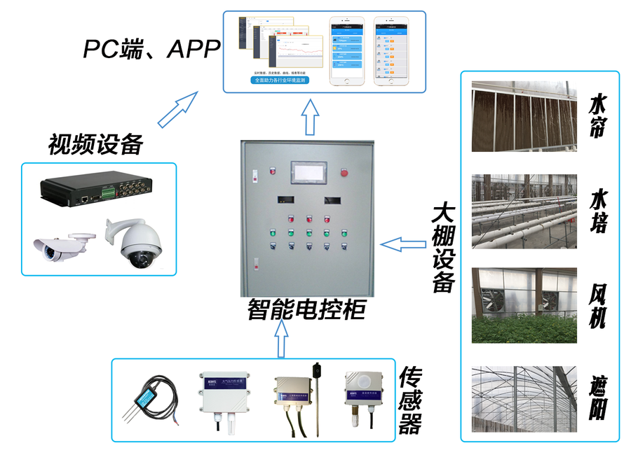 3、智能控制 用戶可利用計算機(jī)、手機(jī)等終端,通過網(wǎng)絡(luò)連接控制室與控制柜,操作控制室內(nèi)中控臺,即可一鍵式控制溫室大棚內(nèi)的風(fēng)機(jī)、外遮陽、內(nèi)遮陽、噴滴灌、側(cè)窗、水簾或大田內(nèi)的水肥噴灌等,實現(xiàn)遠(yuǎn)程化管理。