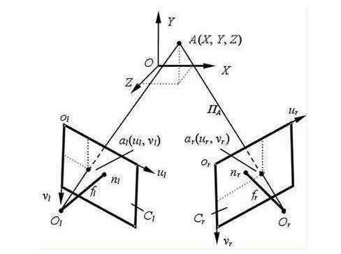 攝像頭采集的每幀圖像經(jīng)過畸變矯正和標(biāo)識(shí)點(diǎn)識(shí)別,再進(jìn)行從對(duì)應(yīng)攝像頭坐標(biāo)系到世界坐標(biāo)系的轉(zhuǎn)換(使用R),可以得到從攝像頭到圖像中各標(biāo)識(shí)點(diǎn)中心在世界坐標(biāo)系下的一組方向矢量。如果一個(gè)標(biāo)識(shí)點(diǎn)同時(shí)出現(xiàn)在兩個(gè)或更多攝像頭拍攝的圖像中,根據(jù)已知的各攝像頭世界坐標(biāo)系空間位置(使用T)以及多幀圖像中對(duì)應(yīng)于該標(biāo)識(shí)點(diǎn)的方向矢量,計(jì)算多個(gè)方向矢量的交點(diǎn)或近似交點(diǎn),可以確定該標(biāo)識(shí)點(diǎn)的世界坐標(biāo),如下圖所示:
