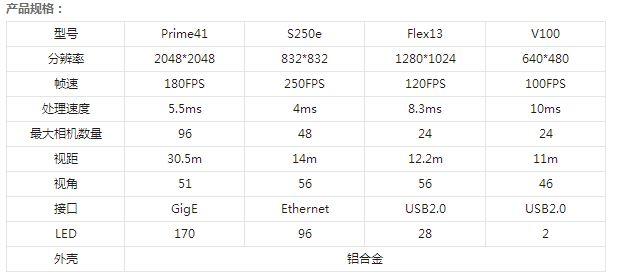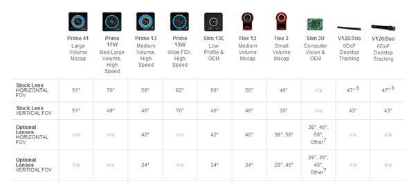 為了保證成像質(zhì)量,OptiTrack攝像頭的視場(chǎng)角一般都比較小。下表是OptiTrack官方給出的各款攝像頭視場(chǎng)角參數(shù)。
