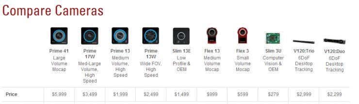 OptiTrack系統(tǒng)最致命的弱點(diǎn)是昂貴的價(jià)格。OptiTrack攝像頭需要有優(yōu)秀的光學(xué)質(zhì)量、高分辨率、高幀率,且需要有高速的圖像處理功能,導(dǎo)致滿足VR使用需求的攝像頭每個(gè)都在1000到幾千美元,下表是OptiTrack官網(wǎng)給出的各款攝像頭的價(jià)格信息:
