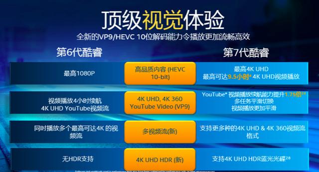 基于高質量內容(HEVC10-bit),相比第六代酷睿處理器最高支持 1080p 視頻播放,這一代產品支持播放最高 4K 視頻,并且能持續播放 9.5 小時。