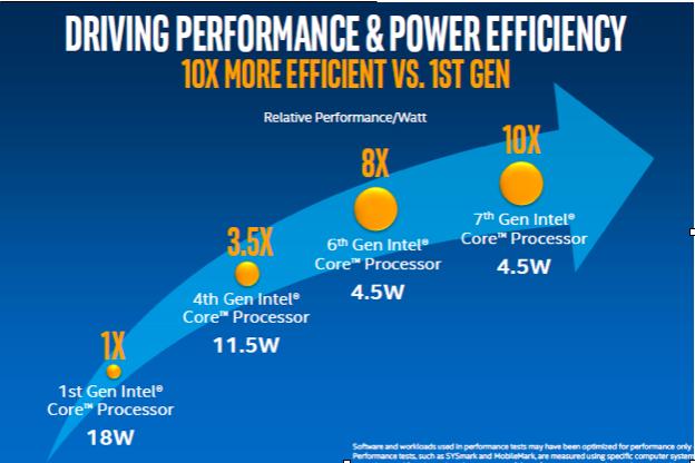 如果以第一代酷睿產品為標桿,第七代酷睿的性能提升 10 倍。
