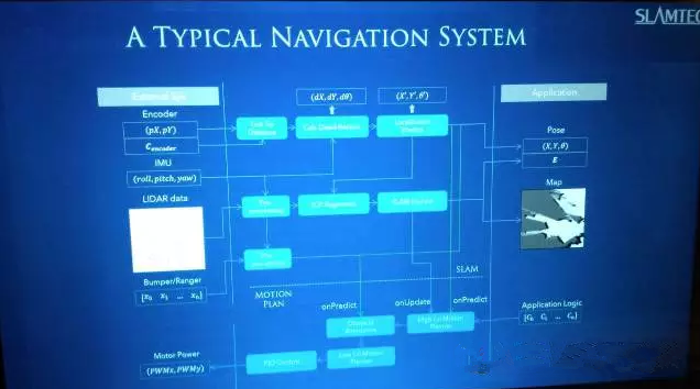 這個(gè)就是一個(gè)比較典型的導(dǎo)航定位系統(tǒng),其中包含了SLAM、路徑規(guī)劃系統(tǒng)以及和激光雷達(dá)協(xié)作的系統(tǒng)構(gòu)架圖。上圖畫面上可能不是特別清楚,但我的主要目就是想和大家闡述一個(gè)觀點(diǎn):到目前為止SLAM系統(tǒng)還是比較復(fù)雜的。