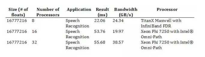 MPI_AllReduce 時間是在英特爾 Xeon Phi 7250 處理器上測定的——在英特爾內(nèi)部的帶有 fat-tree 拓撲的 Intel® Omni-Path Architecture (Intel® OPA) series 100 fabric 結(jié)構(gòu)的 Endeavor 集群上,使用了 Intel MPI 5.1.3.181。