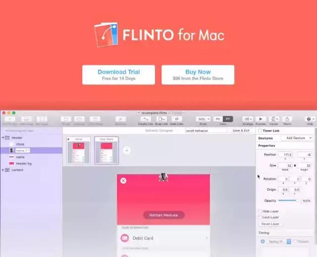 這個(gè)軟件的和上面的flinto有點(diǎn)類似,界面和sketch類似,同時(shí)配合sketch也是非常方便。它主要是做2個(gè)頁(yè)面間過渡專場(chǎng)特效,元素切換,細(xì)節(jié)動(dòng)效的工具。優(yōu)點(diǎn)很明顯,效率高,質(zhì)感好,缺點(diǎn)就是不能做整套原型。
