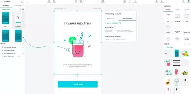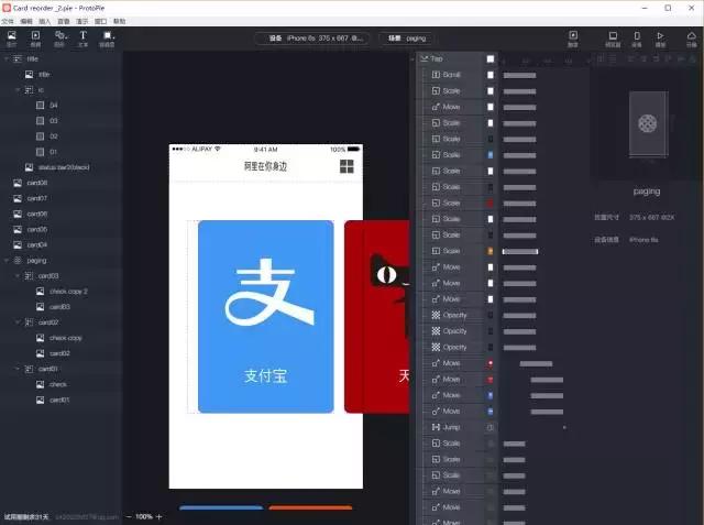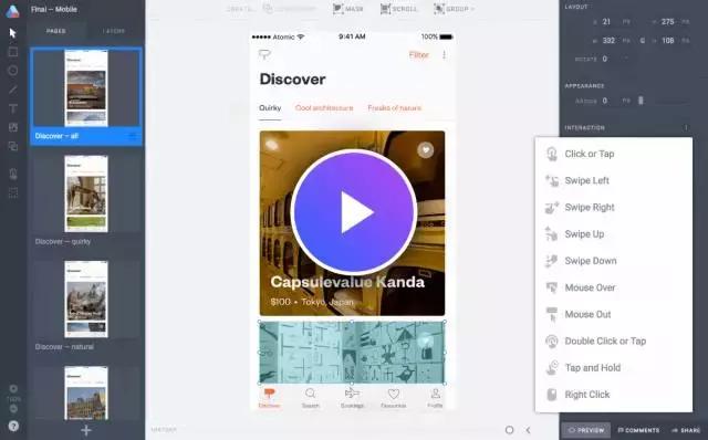 界面跟Sketch很像,如果會(huì)用sketch那么上手很快。能夠快速實(shí)現(xiàn)各種滾動(dòng)、轉(zhuǎn)場(chǎng)、點(diǎn)擊反饋效果。手機(jī)和電腦端的預(yù)覽都非常的流暢。貌似現(xiàn)在用的人不少,下圖是demo: