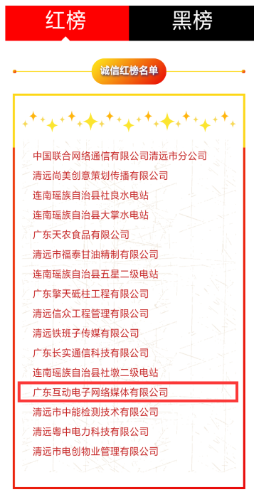我司“廣東互動(dòng)電子網(wǎng)絡(luò)媒體有限公司”榮登“2018清遠(yuǎn)誠(chéng)信紅黑榜之紅榜名單上”。上榜2018清遠(yuǎn)誠(chéng)信紅黑榜之紅榜名單是對(duì)我司已誠(chéng)信為經(jīng)營(yíng)理念的極大肯定,我司將繼續(xù)以誠(chéng)信服務(wù)企業(yè)為宗旨,用心經(jīng)營(yíng)、追求卓越、真誠(chéng)服務(wù)!
