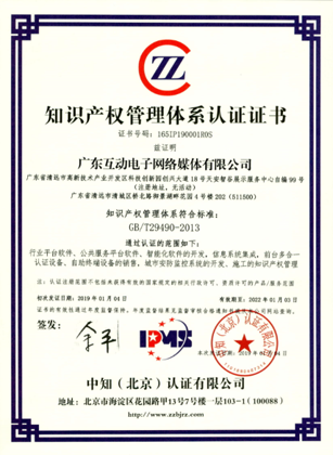 2019年1月4日,廣東互動電子網(wǎng)絡(luò)媒體有限公司順利通過了《企業(yè)知識產(chǎn)權(quán)管理規(guī)范(GB/T-29490-2013)》國家體系認(rèn)證,并獲得由中知(北京)認(rèn)證有限公司頒發(fā)《知識產(chǎn)權(quán)管理體系認(rèn)證證書》,獲得“知識產(chǎn)權(quán)管理體系認(rèn)證證書”標(biāo)志著對我司在知識產(chǎn)權(quán)管理的標(biāo)準(zhǔn)化、規(guī)范化方面極大認(rèn)可,這將是我司發(fā)展史上的又一里程碑。